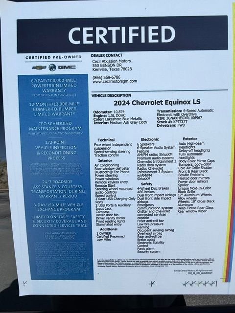 Lakeshore Blue Metallic 2024 Chevrolet Equinox LS FWD 6-Speed Automatic Electronic with Overdrive 1.5L DOHC 1 OWNER, Certified Preowned, Low Miles, 2-Way Power Driver Lumbar Control Seat Adjuster, Bluetooth® For Phone, Body-Color Mirror Caps, Deep-Tinted Rear Glass, Driver 8-Way Power Seat Adjuster, Driver Confidence II Package, Front & Rear Black Bowtie Emblems, Lane Change Alert w/Side Blind Zone Alert, LS Convenience Package, Midnight Edition, Multi-Color Enhanced Driver Instrument Info Display, Preferred Equipment Group 1LS, Rear Cross Traffic Alert, Rear Park Assist w/Audible Warning, Sport Edition, Steering wheel mounted audio controls, Unique Mold-In-Color Black Grille, Wheels: 18 Gloss Black Aluminum.WE ARE OPEN FOR ALL YOUR SALES AND SERVICE NEEDS!!! Odometer is 13751 miles below market average! 26/31 City/Highway MPGCALL 866-240-2964 TO SCHEDULE YOUR TEST DRIVE TODAY!!!