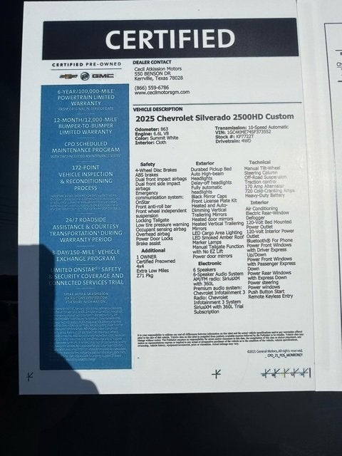 Summit White 2025 Chevrolet Silverado 2500HD Custom 4WD 10-Speed Automatic 6.6L V8 1 OWNER, Certified Preowned, 4x4, Extra Low Miles, Z71 Pkg, 10-Speed Automatic, 4WD, Black Cloth, 10-Way Power Driver Seat Adjuster with Lumbar, 120-Volt Bed Mounted Power Outlet, 120-Volt Interior Power Outlet, 170 Amp Alternator, 2-Speed Electronic Shift Transfer Case, 3.5 Diagonal Monochromatic Display DIC, 3.73 Rear Axle Ratio, Alloy wheels, Apple CarPlay/Android Auto, Auto-Dimming Inside Rear-View Mirror, Black Mirror Caps, Bluetooth® For Phone, Chevrolet Connected Access Capable, Color-Keyed Carpeting Floor Covering, Compass, Custom Convenience Package, Custom Value Package, CX Safety Package, Deep-Tinted Glass, Dual Rear USB Ports (charge Only), Durabed Pickup Bed, Electric Rear-Window Defogger, Electronic Cruise Control with Set and Resume Speed, EZ Lift Power Lock and Release Tailgate, Front Rubberized Vinyl Floor Mats, HD Rear Vision Camera, Heated and Auto-Dimming Vertical Trailering Mirrors, Heated Vertical Trailering Mirrors, Hill Descent Control, Lane Change Alert with Side Blind Zone Alert, LED Cargo Area Lighting, Locking Tailgate, Manual Tailgate Function with No EZ Lift, Manual Tilt-Wheel Steering Column, Off-Road Suspension, OnStar Services Capable, Panic alarm, Power Door Locks, Power Front Windows with Driver Express Up/Down, Power Front Windows with Passenger Express Down, Power Rear Windows with Express Down, Power Take-Off, Preferred Equipment Group 1CX, Premium audio system: Chevrolet Infotainment 3, Push Button Start, Rear 60/40 Folding Bench Seat (folds Up), Rear Cross Traffic Alert, Rear Rubberized Vinyl Floor Mats, Remote Keyless Entry, Remote Vehicle Starter System, SiriusXM with 360L Trial Subscription, Standard Tailgate, Suspension Package, Ultrasonic Front and Rear Park Assist, Unauthorized Entry Theft-Deterrent System, Wheels: 20 10-Spoke Machined Aluminum, Wi-Fi Hotspot Capable, Wireless Phone Projection, Z71 Off-Road Package.